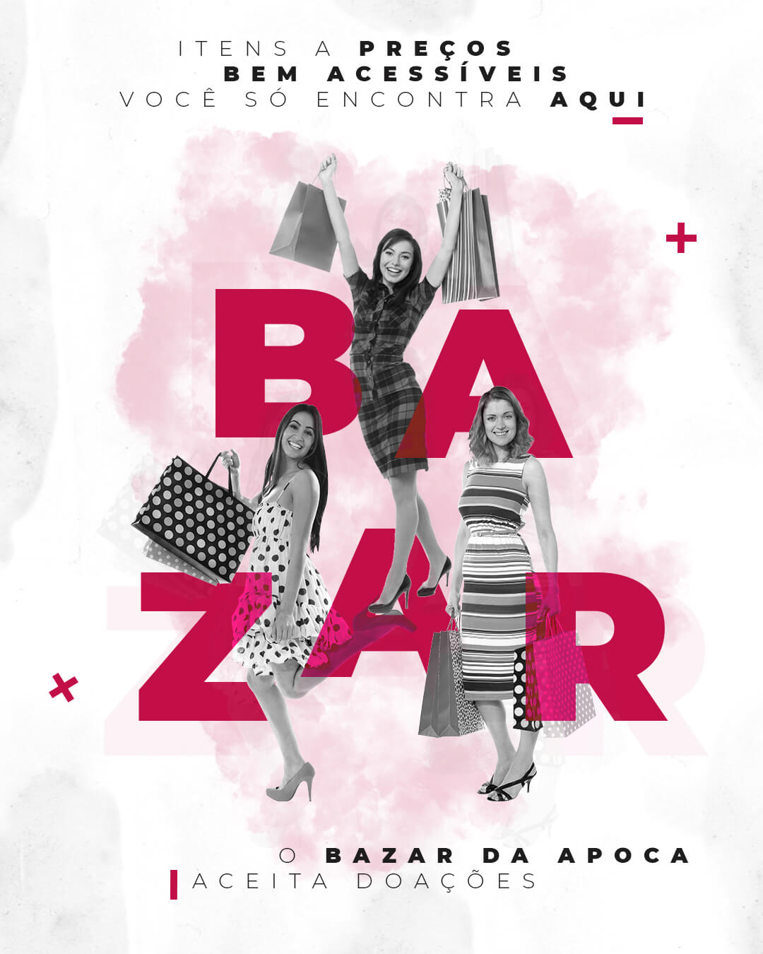 Nessa arte, escolhi qual seria a palavra em destaque, nesse caso a palavra escolhida foi “BAZAR”. Com a palavra definida, fui buscar as imagens. As imagens não podem ser selecionadas do Google, por exemplo, pois a maioria delas possui direitos autorais. As imagens precisam ser adquiridas de um banco de imagens, seja ele gratuito ou pago. Nesse banco de imagens, baixamos imagens de alta definição e com licença de uso.